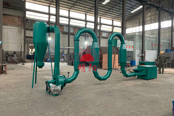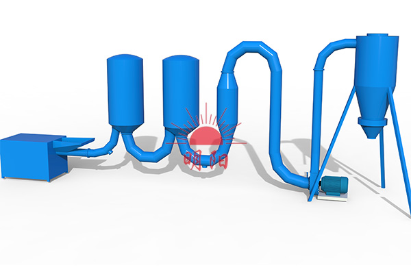 原料通過進料口由管道進入爐子,繞管道連同熱風一起被風機抽到沙克隆里。烘干好的物料由沙克隆里放出來,廢熱氣、水蒸氣從沙克隆上面出去。